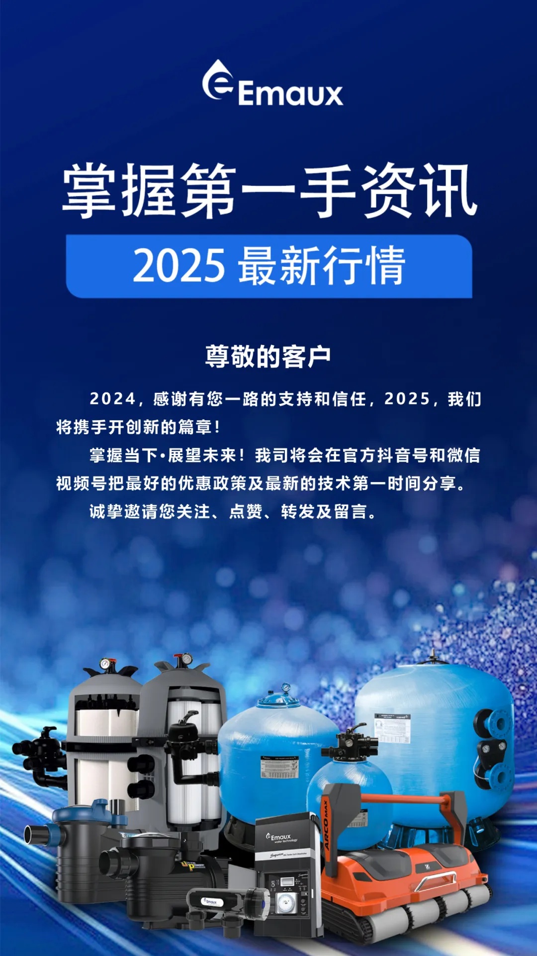意萬仕集團(Emaux Group),國際水處理行業領軍企業之一,我們在游泳池行業擁有40多年豐富的知識,是一家用心為您提供泳池設備解決方案的專業生產商, 為全球十大泳池設備供貨商之一。 集團擁有超過10萬平方米的生產基地,集研發、生產、質量控制、培訓, 銷售和售后支持于一體,確保我們的工廠能夠為客戶提供多樣化和創新的泳池和各類水處理設備,滿足高標準的質量,性能和設計.